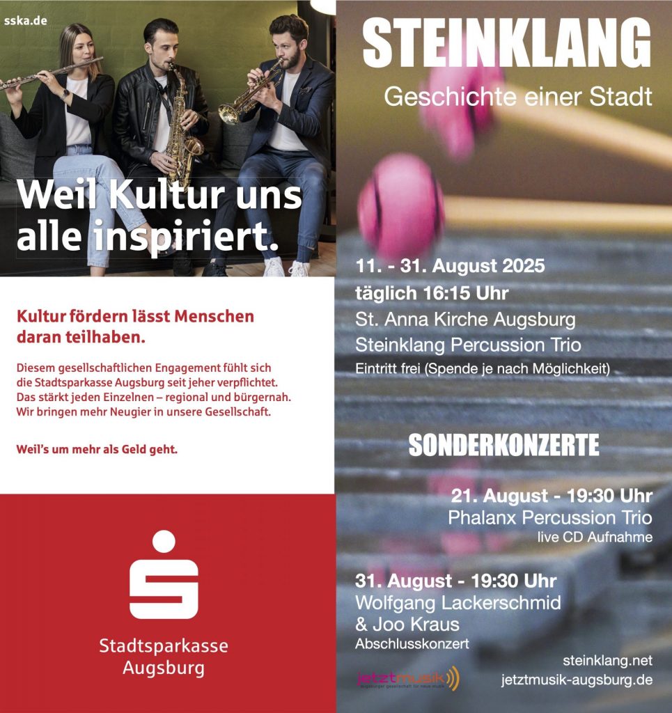 ich begrüße Sie herzlich zur außergewöhnlichen „Steinklang“ Konzertreihe, die nun seit 15 Jahren das Augsburger Musikleben im Sommer mit seiner originellen und facettenreichen Klangfarbe bereichert.