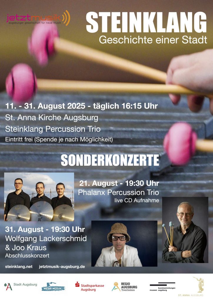 Die im Jahr 2009 von Wolfgang Lackerschmid speziell dafür geschaffene Komposition „Steinklang – Geschichte einer Stadt“ ist ein faszinierendes Werk, das archaische Klänge mit Instrumenten aus Stein entstehen lässt. Der Komponist hat sich dabei intensiv mit der Geschichte Augsburgs auseinandergesetzt und das Konzerterlebnis immer wieder mit unterschiedlichen neuen Werken ergänzt. Die Aufführungen mit den rein akustisch erzeugten Klängen haben in all den Jahren einen nachhal- tigen Eindruck hinterlassen und tragen dazu bei, das Image Augsburgs als kulturelles Zentrum zu stärken. Die einzigartigen Steininstrumente und die innovative Komposition machen den Steinklang zu einem kulturellen Alleinstellungsmerkmal der Stadt.